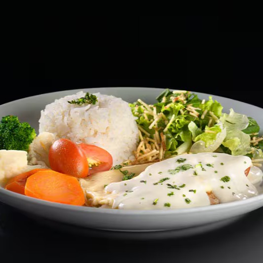 File de frango grelhado,peito de perú,mussarela e Catupiry acompanha arroz e fritas