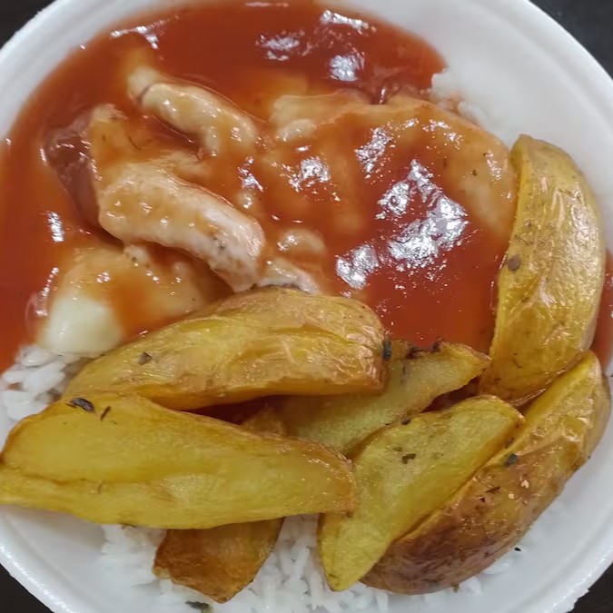Desfrute de nossa 'Calabresa Acebolada' servida em uma marmitex média, perfeitamente embalada para preservar todo o sabor. Este prato é generosamente acompanhado por um arroz branco soltinho e saboroso, feijão fresco e bem temperado, farofa crocante e deliciosa, e batatas fritas douradas e crocantes. Uma combinação irresistível que promete satisfazer o seu paladar. Ideal para uma refeição completa e equilibrada. Experimente e se apaixone por este verdadeiro deleite culinário.