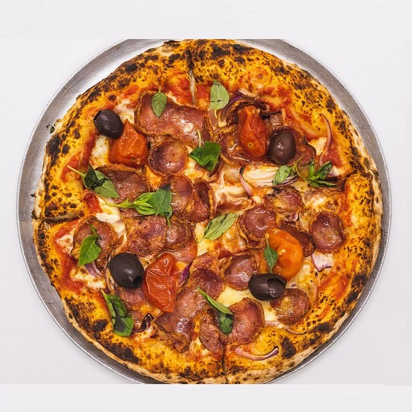 Massa tradicional, molho de tomate, calabresa e cebola.