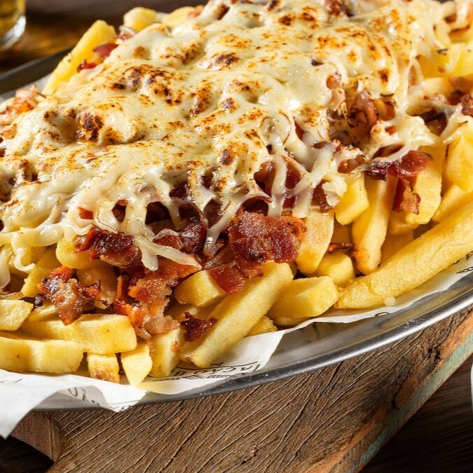 Porção de batatas fritas quentinhas com queijo derretido e bacon crocante, um clássico que todo mundo ama.