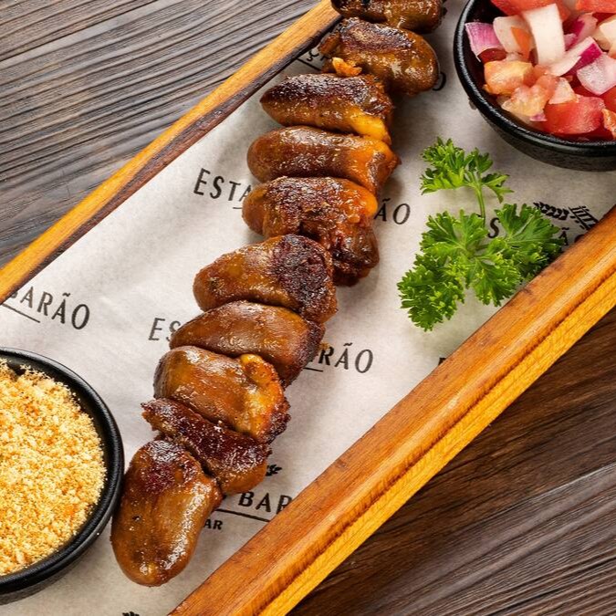 Clássico do churrasco! Corações bem temperados, macios e suculentos.