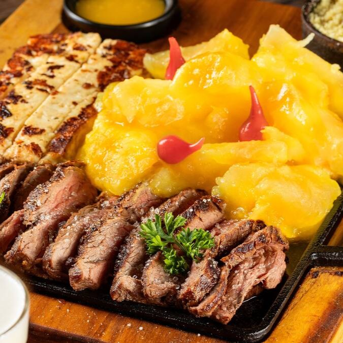 Carne saborosa e grelhada, suculência em cada pedaço.