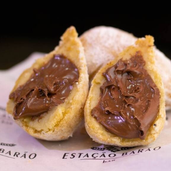 Coxinha recheada com Nutella generosa e cremosa, empanada no açúcar confeiteiro.