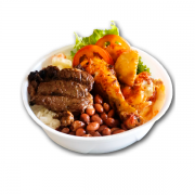 Marmita tamanho M bem servida com arroz soltinho, feijão caseiro, batata frita crocante, farofa e frango a parmegiana suculento preparado na hora. Uma refeição completa com gostinho de comida caseira.