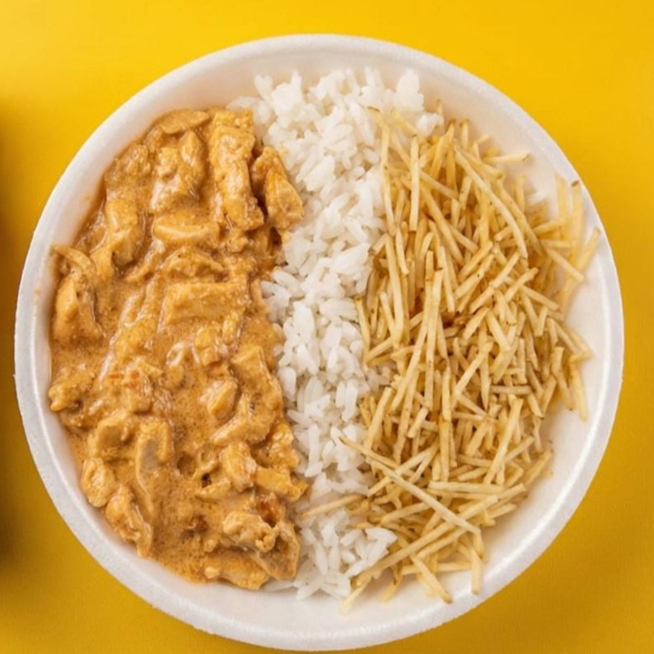 Arroz, strogonoff de frango e batata palha. COMBO COM 2 MARMITAS DE 450 GRAMAS.