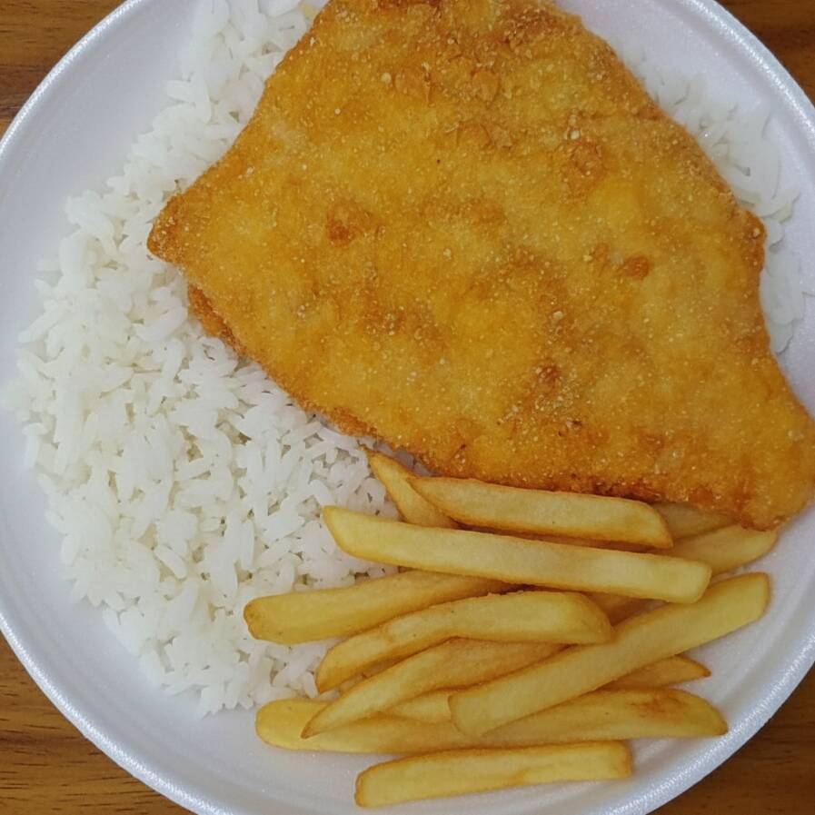 Arroz branco, parmegiana de frango e batata frita. Aproximadamente 450 gramas, serve bem 1 pessoa.