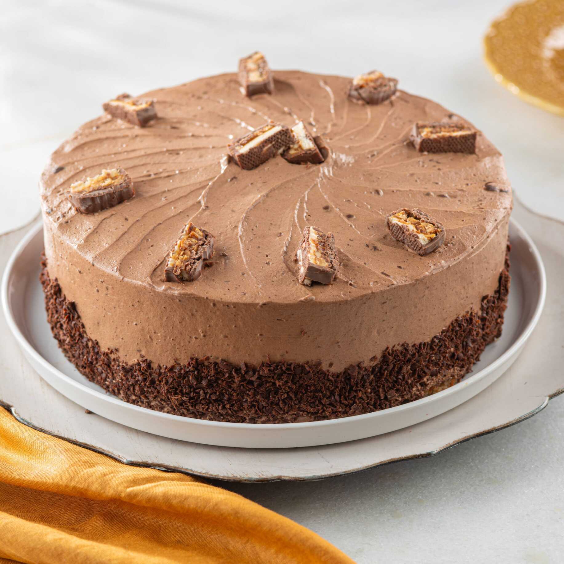 Bolo caseiro de leite com duas camadas de recheio cremoso Charge, coberto com chantilly e pedaços de bombom Charge. Imagem meramente ilustrativa. Bolo pequeno serve até 8 fatias. Bolo grande serve até 16 fatias.
