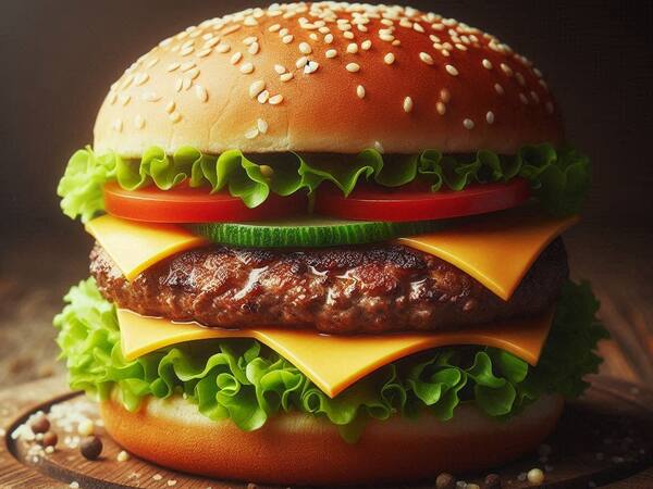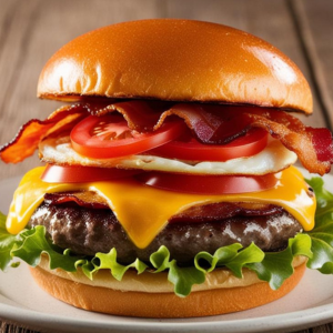 Pão, hambúrguer, queijo, bacon, alface, tomate