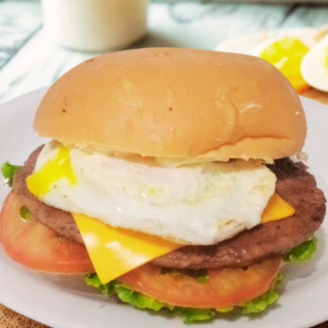 Pão, Hambúrguer 90g, presunto, queijo, ovo, alface, tomate.