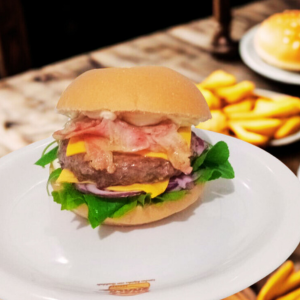 ( 2 Hambúrguer 90g ,2 queijo,2 presuntos, anel de cebola, Cheddar, alface)