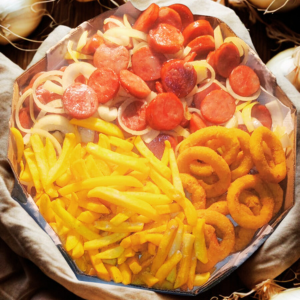 119) Calabresa + Fritas + Anéis De Cebola ( Serve 4-5 Pessoas)