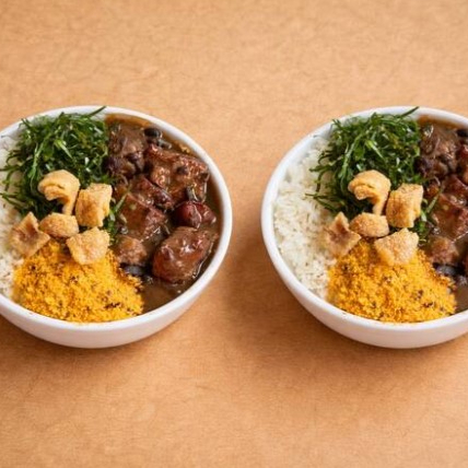 2 Feijoadas com calabresa e bisteca suina, arroz, couve fresca, torresmo (pururuca) e farofa.