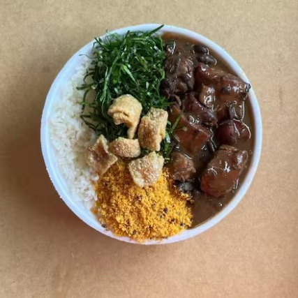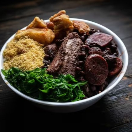 Feijoada com calabresa e bisteca suina, arroz, couve fresca, torresmo (pururuca) e farofa.