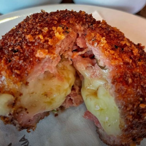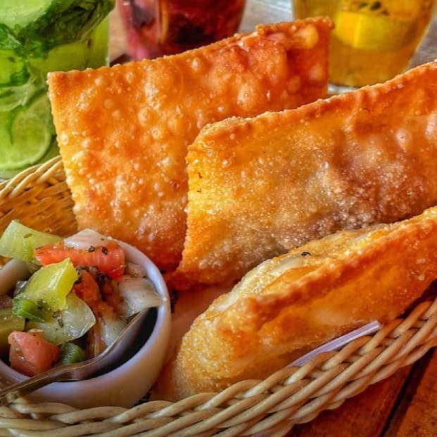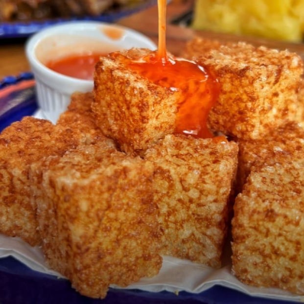 Bolinho artesanal de linguiça recheado com queijo derretido e banana da terra super crocantes. Acompanhada de Vinagrete.