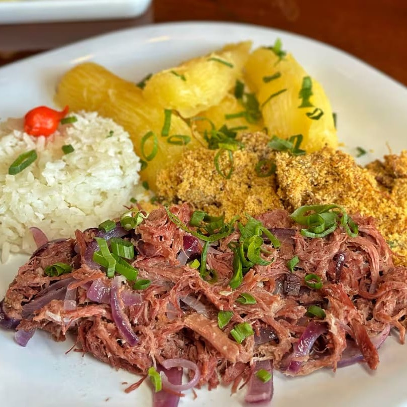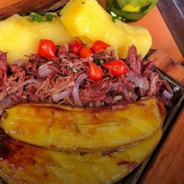 Carne seca desfiada na manteiga de garrafa, servida com macaxeira cozida, banana caramelizada, pimenta biquinho e toque de cebolinha fresca.