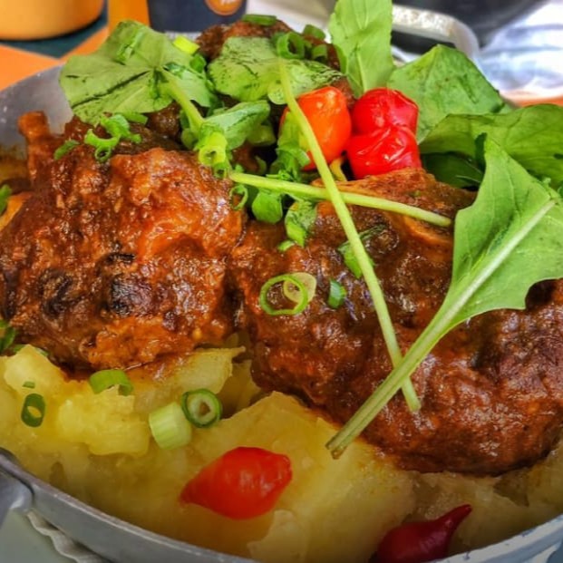 Rabada com agrião assada e cozida na cerveja preta, super macia e saborosa. Acompanha macaxeira (aipim) cozida e arroz soltinho.