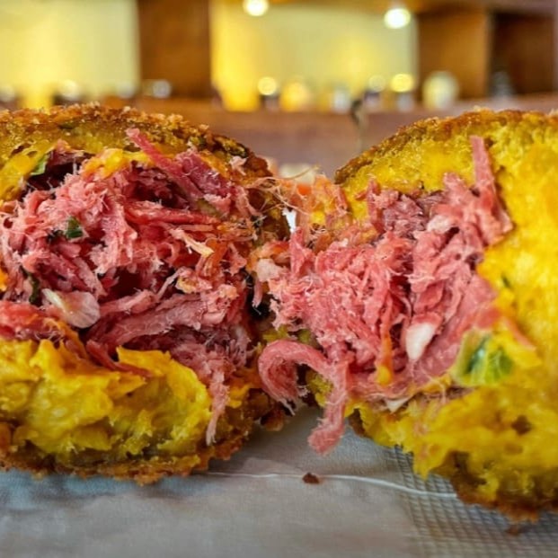 Bolinho artesanal de Abobora, crocante e recheado com carne seca desfiada e temperada. Acompanhada de Vinagrete.