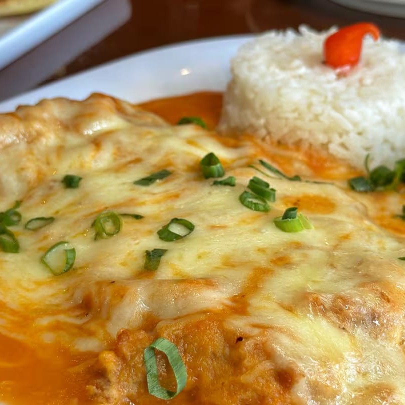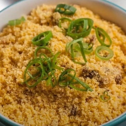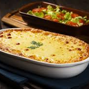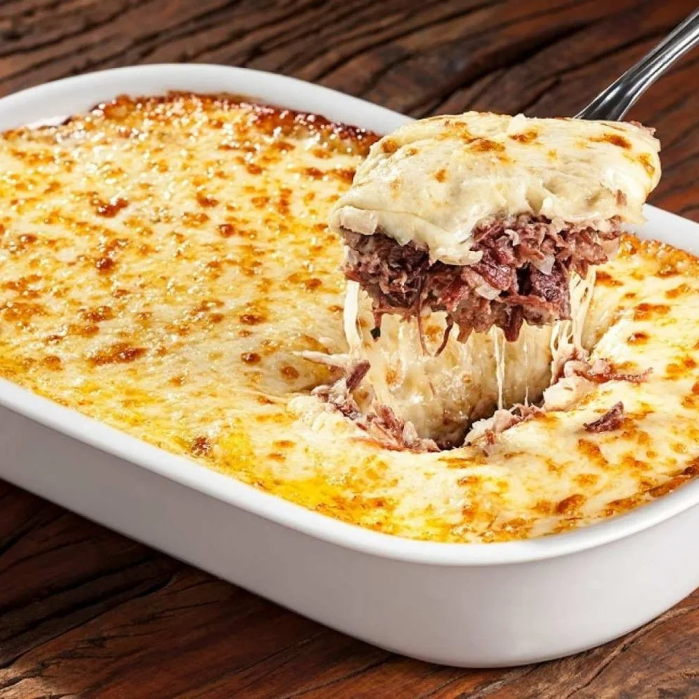 Escondidinho nordestino com recheio de carne seca desfiada, purê cremoso de macaxeira (aipim) e um delicioso queijo coalho gratinado. Acompanha Arroz.