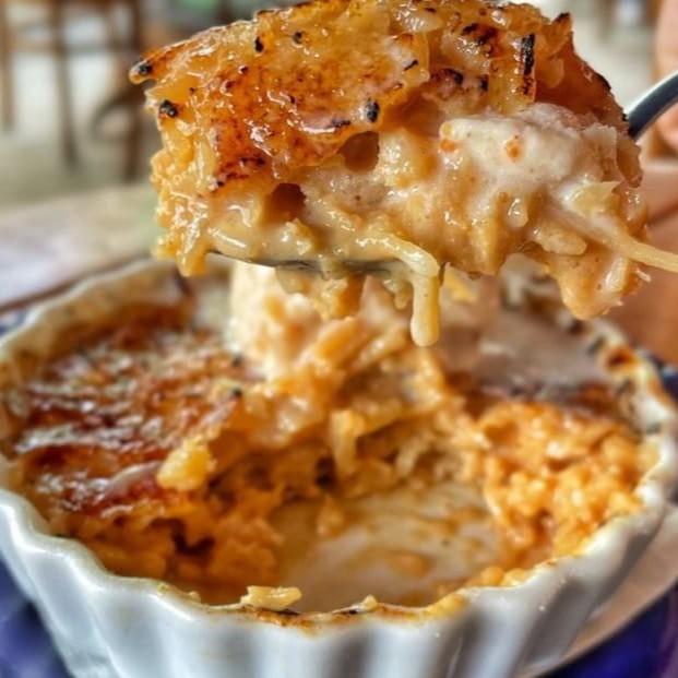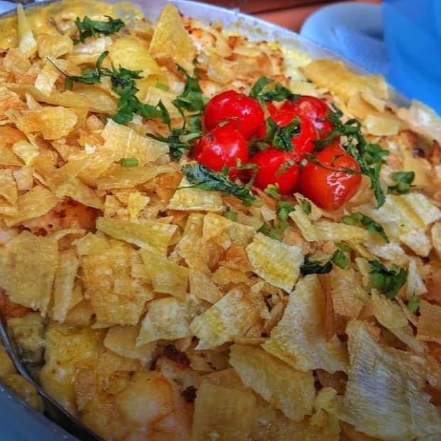 Arroz cremoso com Catupiry, camarão, carne seca, gratinado com queijo coalho e finalizado com chips de macaxeira.