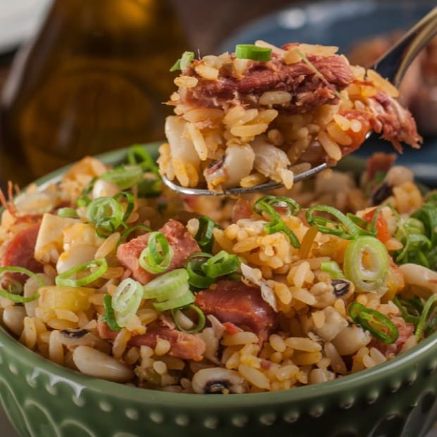 O tradicional arroz com feijão é puxado na manteiga de garrafa e com carne seca desfiada, linguiça calabresa, bacon, pimentão verde e queijo coalho.