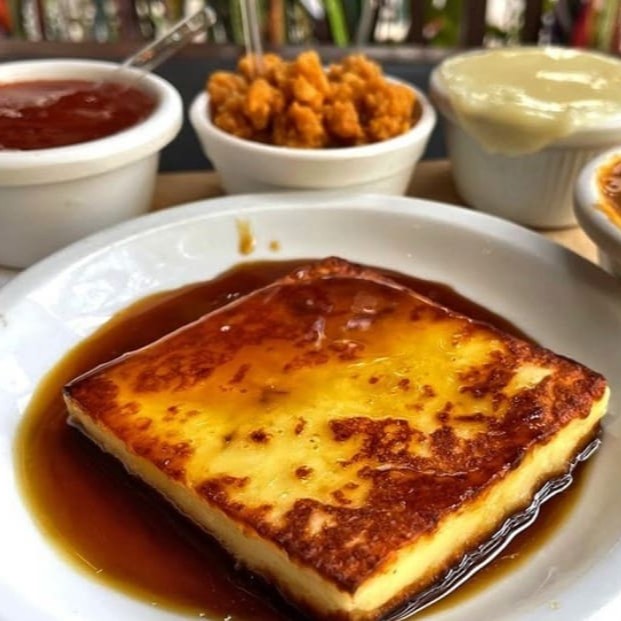 Pedaço de queijo coalho derretido. Acompanhado com Abobora com coco, ambrosia, cocada, goiabada cascão ou doce de abóbora.