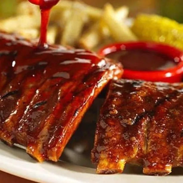 tradicional costela suína assada com molho barbecue, acompanha arroz carreteiro, mandioca cozida e feijão tropeiro.