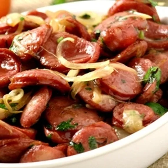 linguiça acebolada com azeitonas, vinagrete e farofa