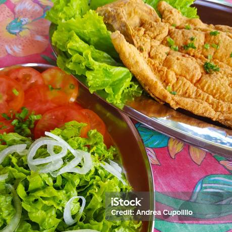 filés de tilápia, acompanha mandioca cozida e mix de folhas.