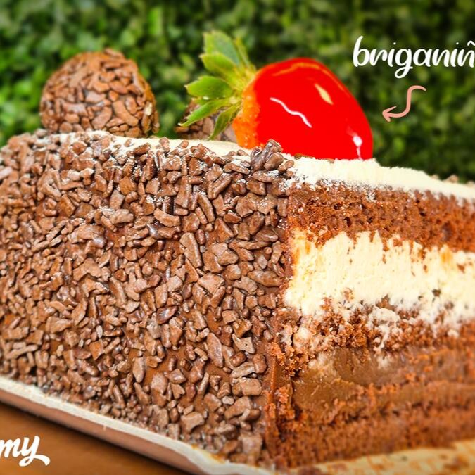 Pão de ló de chocolate, uma camada de recheio de brigadeiro e uma camada de creme nino, finalizado com cobertura de ganache e granulado.