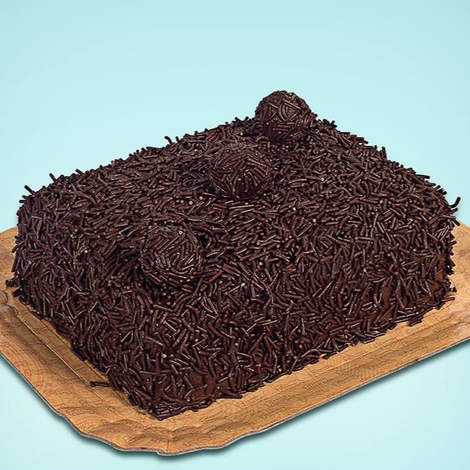 Pão de ló, recheio brigadeiro, cobertura Brigadeiro e Granulado.