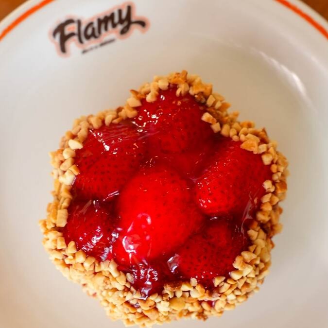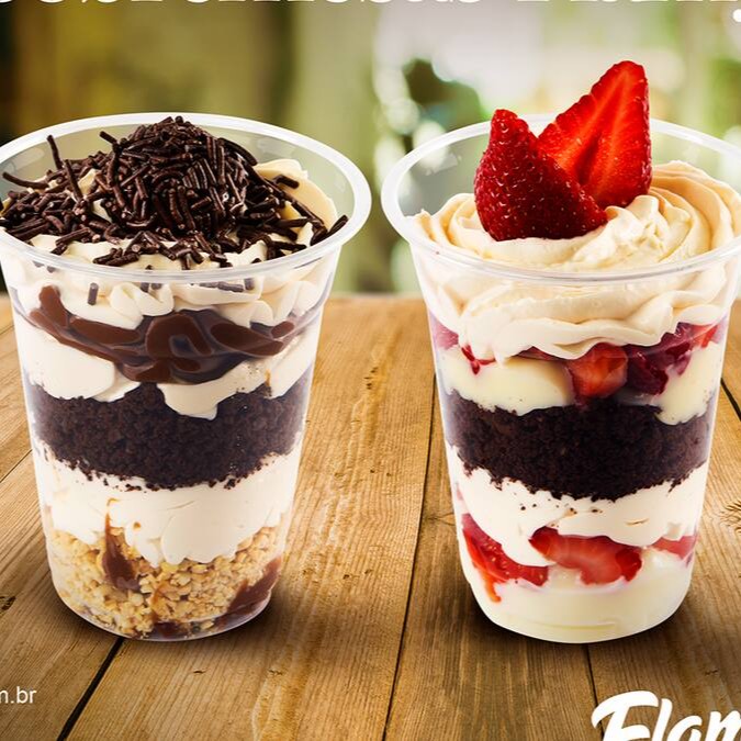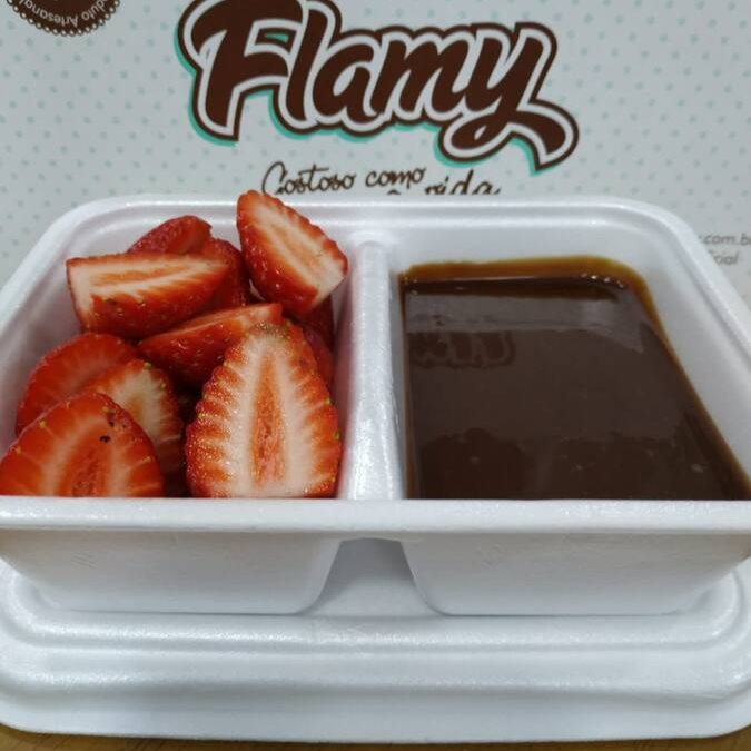 Açaí, leite em pó, morangos, frescos, leite condensado e creme Flamy