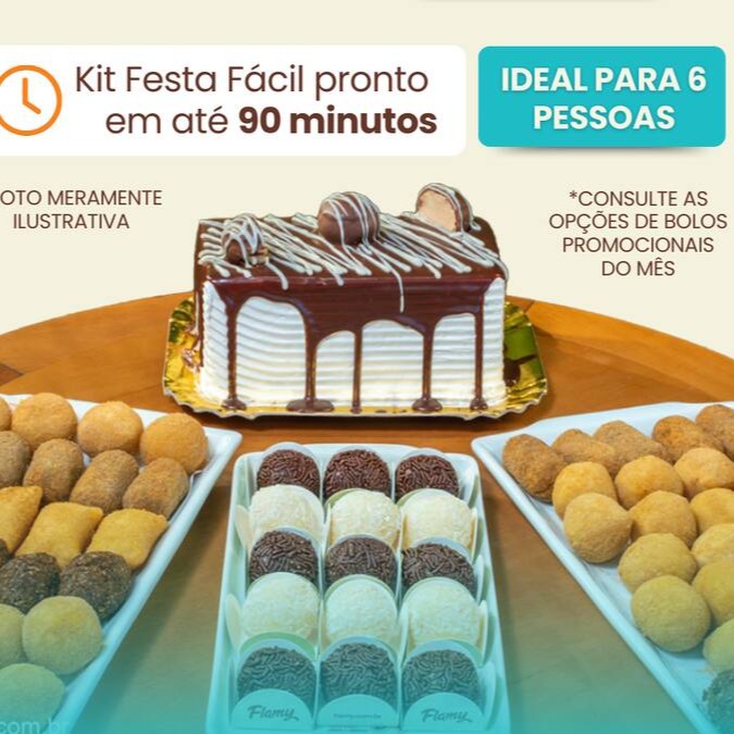Ideal para pequenas comemorações, o Kit Festa Promo 06 traz o melhor para sua festa com um bolo delicioso e uma seleção de salgados e docinhos que vão agradar a todos. Simples e saboroso, perfeito para momentos especiais!