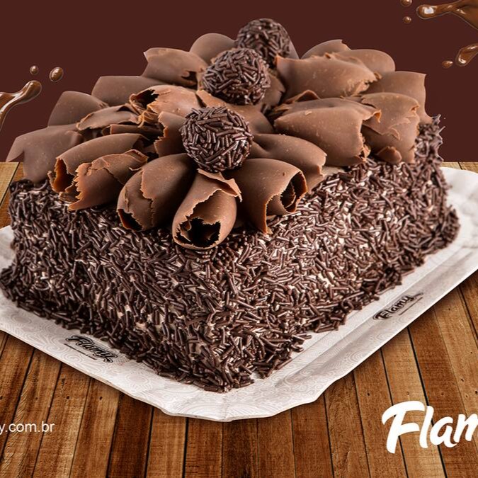 Massa de pão de ló de chocolate com recheio brigadeiro, creme gelado, suspiros e raspas de chocolate.