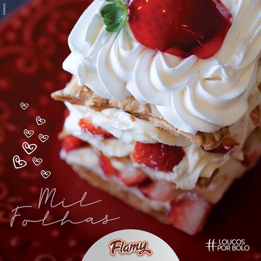 Com camadas crocantes e cremosas de massa folhada e intercaladas com um suave creme Ninho, morangos e avela.