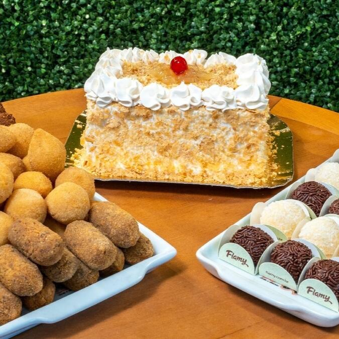 Uma fatia do bolo do mês, 6 mini salgadinhos fritos mistos e 3 docinhos (brigadeiro e beijinho)