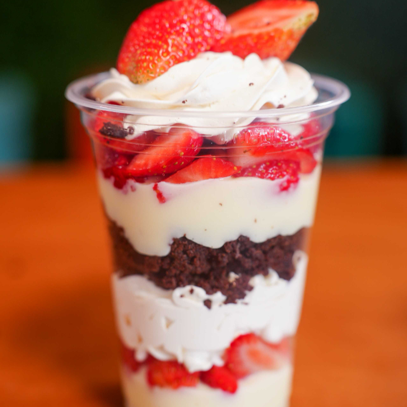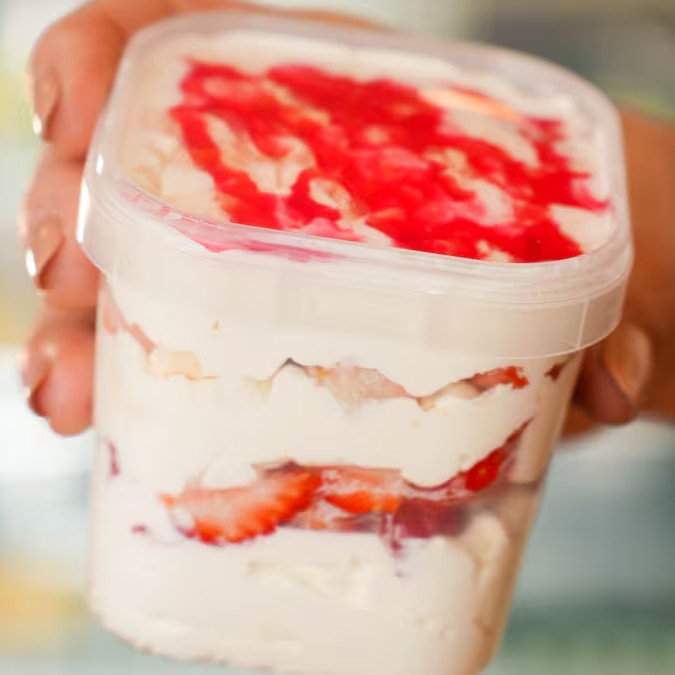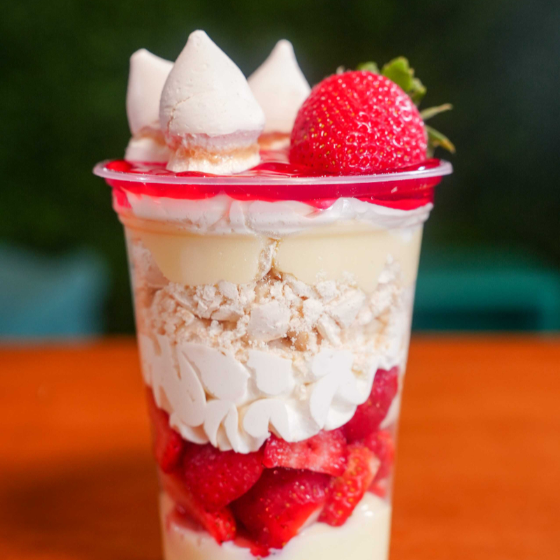Sorvete de Creme, morangos, creme nino e massa folhada. Vem no copo bolha