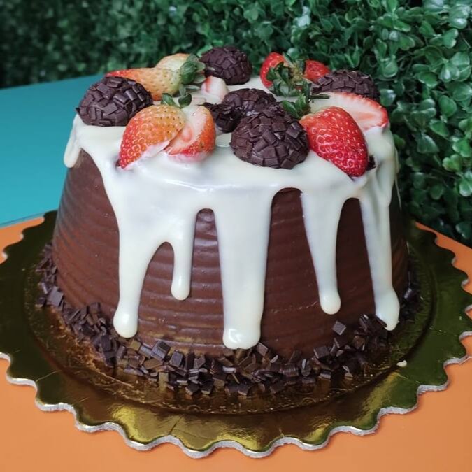Delicioso Bolo Vulcão de Chocolate, com massa macia e cobertura irresistível de Ganache Preto e Trufa Branca. Decorado com docinhos de brigadeiro e morangos frescos, esse bolo caseirinho é uma explosão de sabores e texturas que vai te conquistar. Uma opção perfeita para adoçar seus momentos especiais. Experimente!