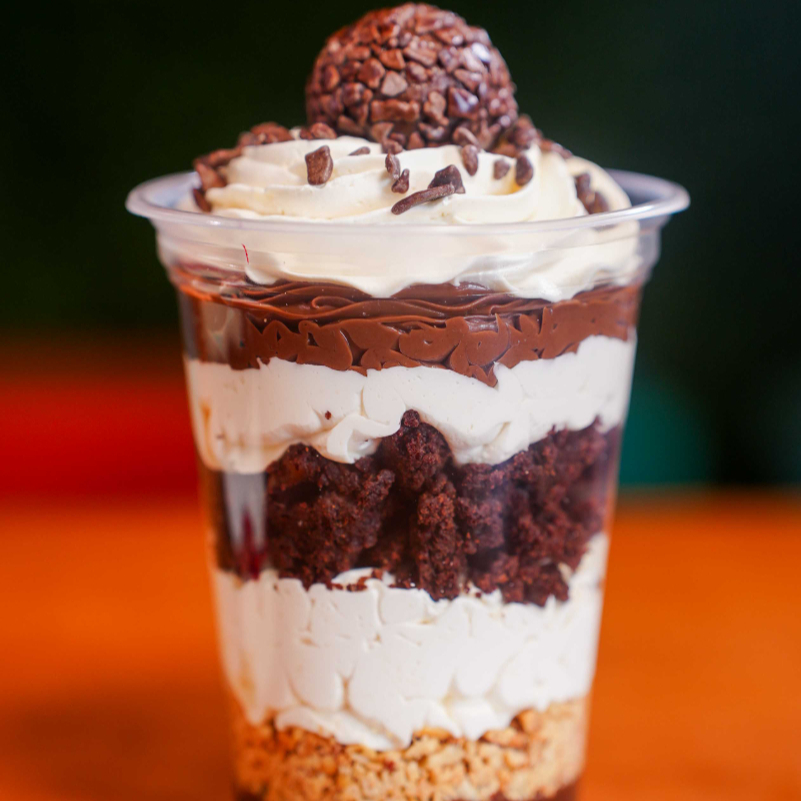 Brigadeiro cremoso, amendoim, creme ninho, brownie e creme de avelã