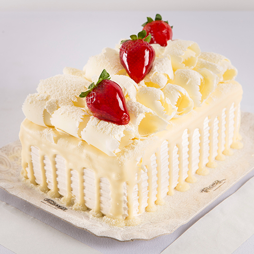 Massa Branca com recheio de creme niño, morangos e raspas de chocolate branco.