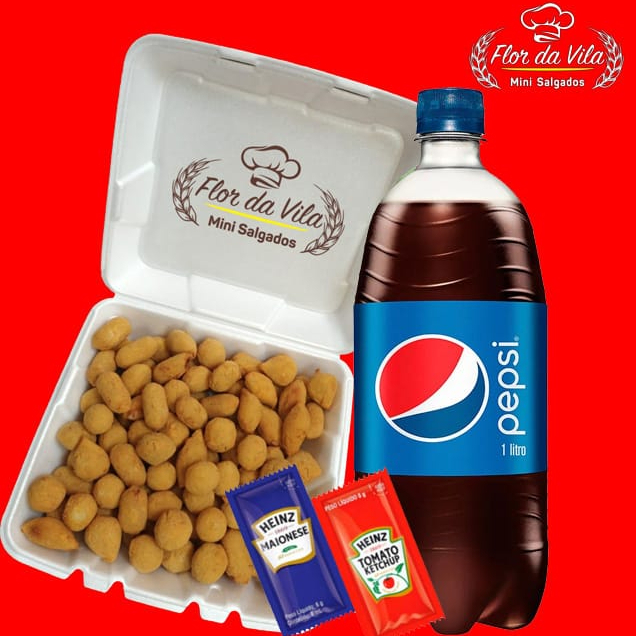100 Deliciosos mini salgados(13grs). 5 Sabores: Coxinha, presunto e queijo, rissole de carne, enroladinho de salsicha e requeijão. Acompanha Pepsi 1L. Acompanha Molhos Heinz. Embalagem Isopor. Não aceitamos alterações neste Mix promocional.