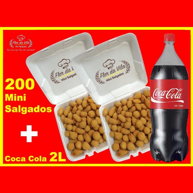 200 Mini Salgados Mistos(13grs) - 5 Sabores: Coxinha, pres./queijo, enroladinho de salsicha, requeijão e rissole de carne. Embalagem isopor. Acompanha Coca Cola 2l. Não podemos alterar os sabores deste item promocional.