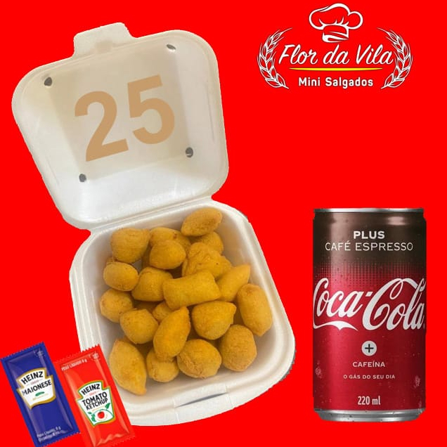 25 Deliciosos mini salgados(13grs). 5 Sabores: Coxinha, presunto e queijo, rissole de carne, enroladinho de salsicha e requeijão. Acompanha Coca café expresso 220ml. Acompanha molhos Heinz. Embalagem Isopor. Não aceitamos alterações neste Mix promocional.