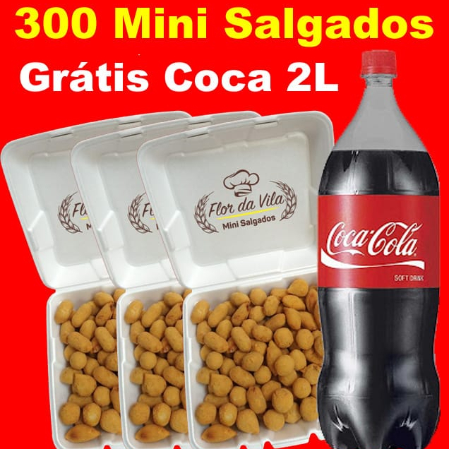 300 Mini Salgados Mistos - 5 Sabores: Coxinha, pres./queijo, enroladinho de salsicha, requeijão e rissole de carne. GRÁTIS COCA COLA 2L. Embalagem isopor. Não podemos alterar os sabores deste item promocional.