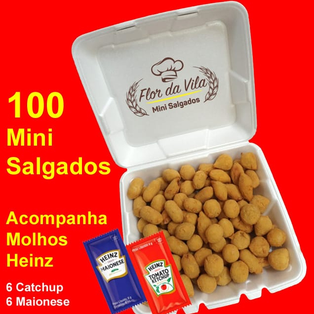 100 Mini Salgados Mistos(13grs) - 5 Sabores: Coxinha, pres./queijo, enroladinho de salsicha, requeijão e rissole de carne. Acompanha molhos Heinz. Embalagem isopor. Não podemos alterar os sabores deste item promocional.