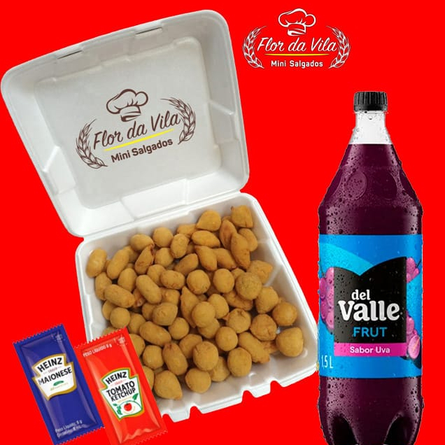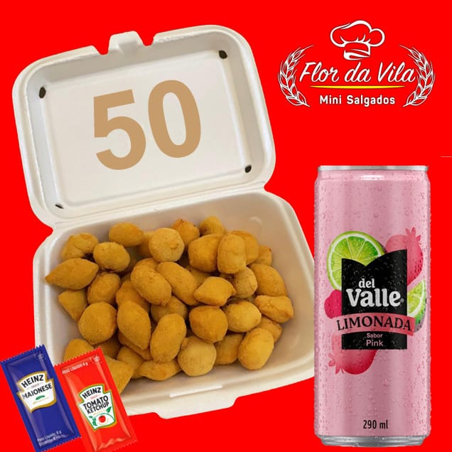 50 Deliciosos mini salgados(13grs). 5 Sabores: Coxinha, presunto e queijo, rissole de carne, enroladinho de salsicha e requeijão. Acompanha Limonada Pink Del Valle 290ml. Acompanha molhos Heinz. Embalagem Isopor. Não aceitamos alterações neste Mix promocional.