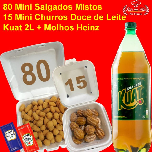 80 Mini Salgados Mistos(13grs) - 4 Sabores + 15 Mini Churros Doce De Leite + Kuat 2l + Molhos Heinz (80-3)