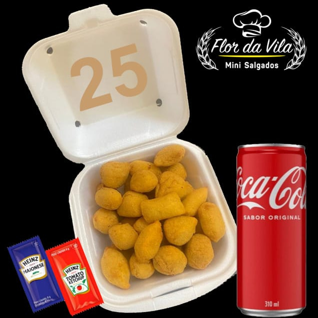 25 Deliciosos mini salgados(13grs). 5 Sabores: Coxinha, presunto e queijo, rissole de carne, enroladinho de salsicha e requeijão. Acompanha Coca Cola 200ml. Acompanha molhos Heinz. Embalagem Isopor. Não aceitamos alterações neste Mix promocional.