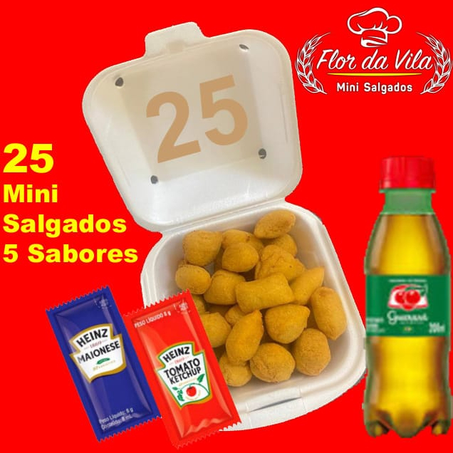 25 Deliciosos mini salgados(13grs). 5 Sabores: Coxinha, presunto e queijo, rissole de carne, enroladinho de salsicha e requeijão. Acompanha Guaraná Antarctica 200ml. Acompanha molhos Heinz. Embalagem Isopor. Não aceitamos alterações neste Mix promocional.