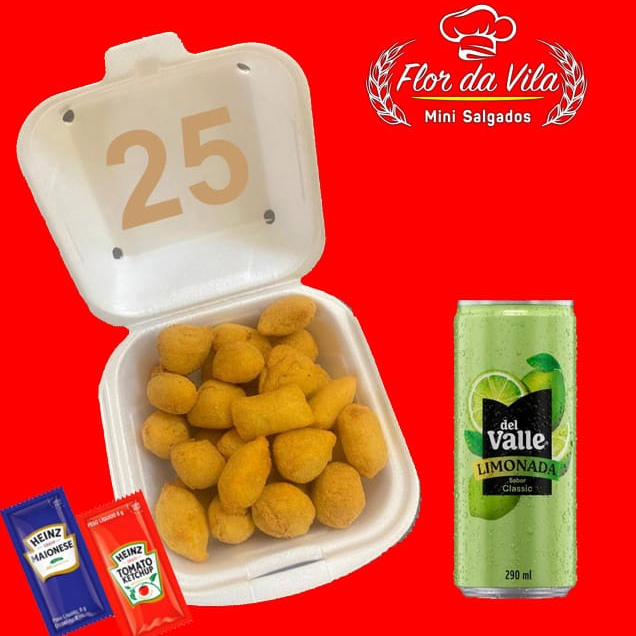 25 Deliciosos mini salgados(13grs). 5 Sabores: Coxinha, presunto e queijo, rissole de carne, enroladinho de salsicha e requeijão. Acompanha Limonada Classic Del Valle 290ml. Acompanha molhos Heinz. Embalagem Isopor. Não aceitamos alterações neste Mix promocional.