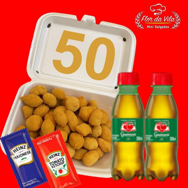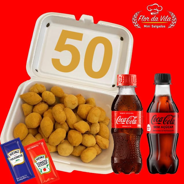 50 Deliciosos mini salgados(13grs) - 5 Sabores: Coxinha, presunto e queijo, rissole de carne, enroladinho de salsicha e requeijão. Acompanha 2 cocas 200ml (1 Normal e 1 Zero). Acompanha Molhos Heinz Não aceitamos alterações neste Mix promocional.